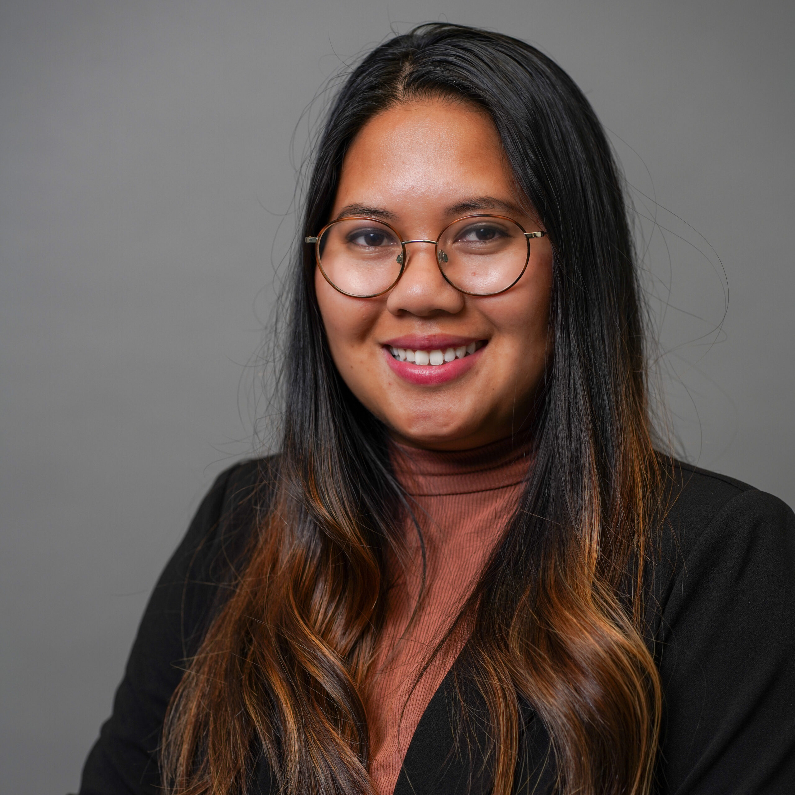 A woman with long, dark, braided hair wears glasses, dangling earrings, and a sleeveless dark dress. She is smiling and standing in front of a blue background.