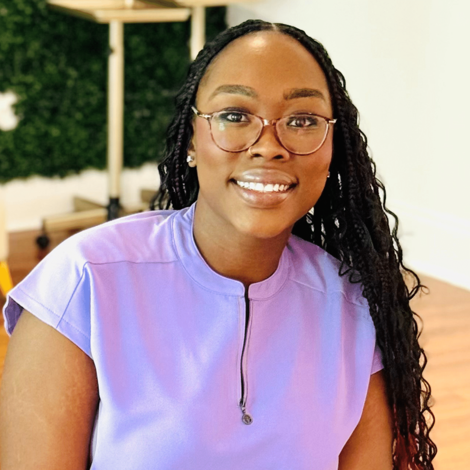 A woman with long braids smiles while sitting in a car. She is wearing a white collared shirt and layered necklaces.